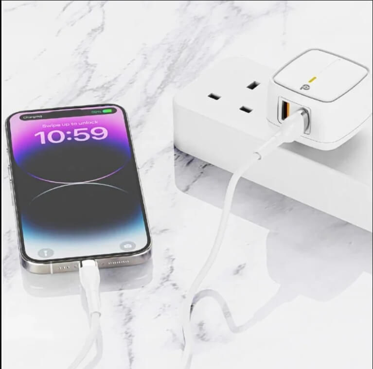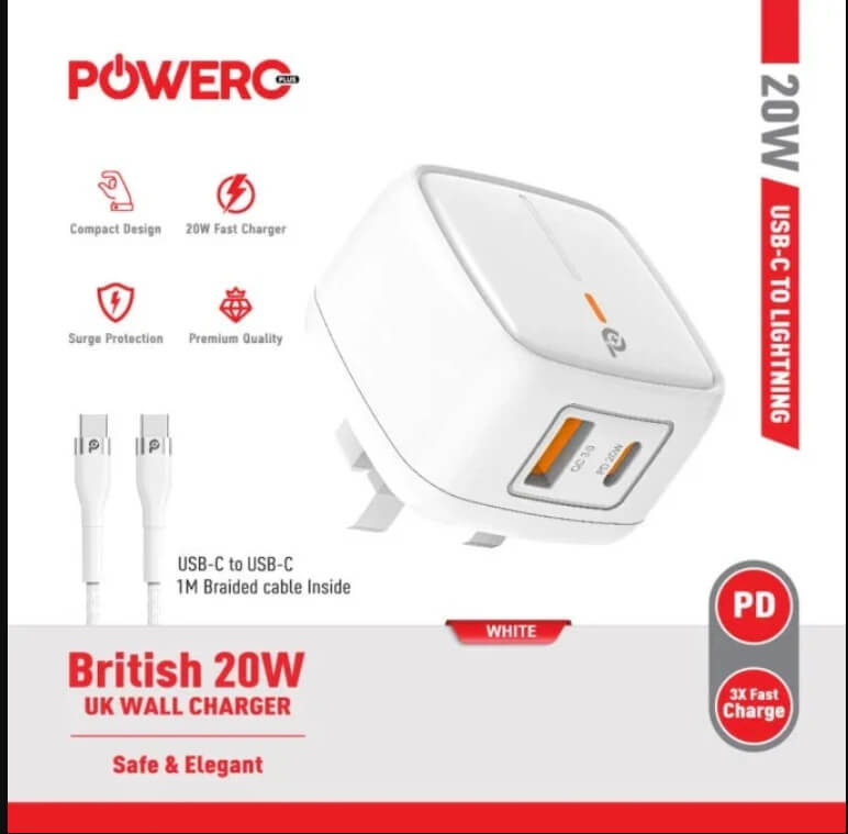 ادابتر شحن مع كيبل شاحن حائط Powero+ بريطاني بقوة 20 وات مع كابل من النوع C إلى النوع C
