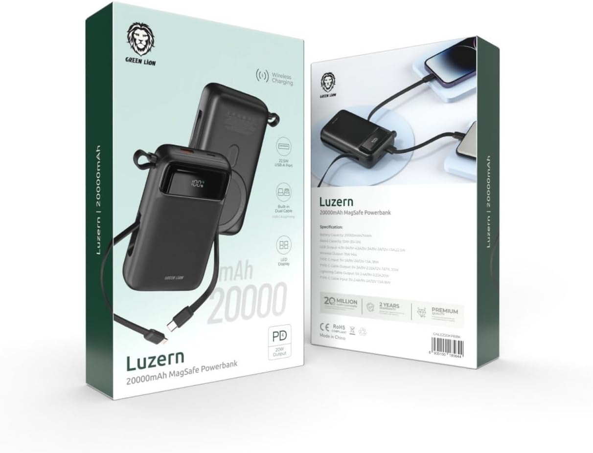 بور بانك 20 الف مع كيبلات مدمجة وشاحن لاسلكي Green Lion Luzern 20K mAh MagSafe – أسود
