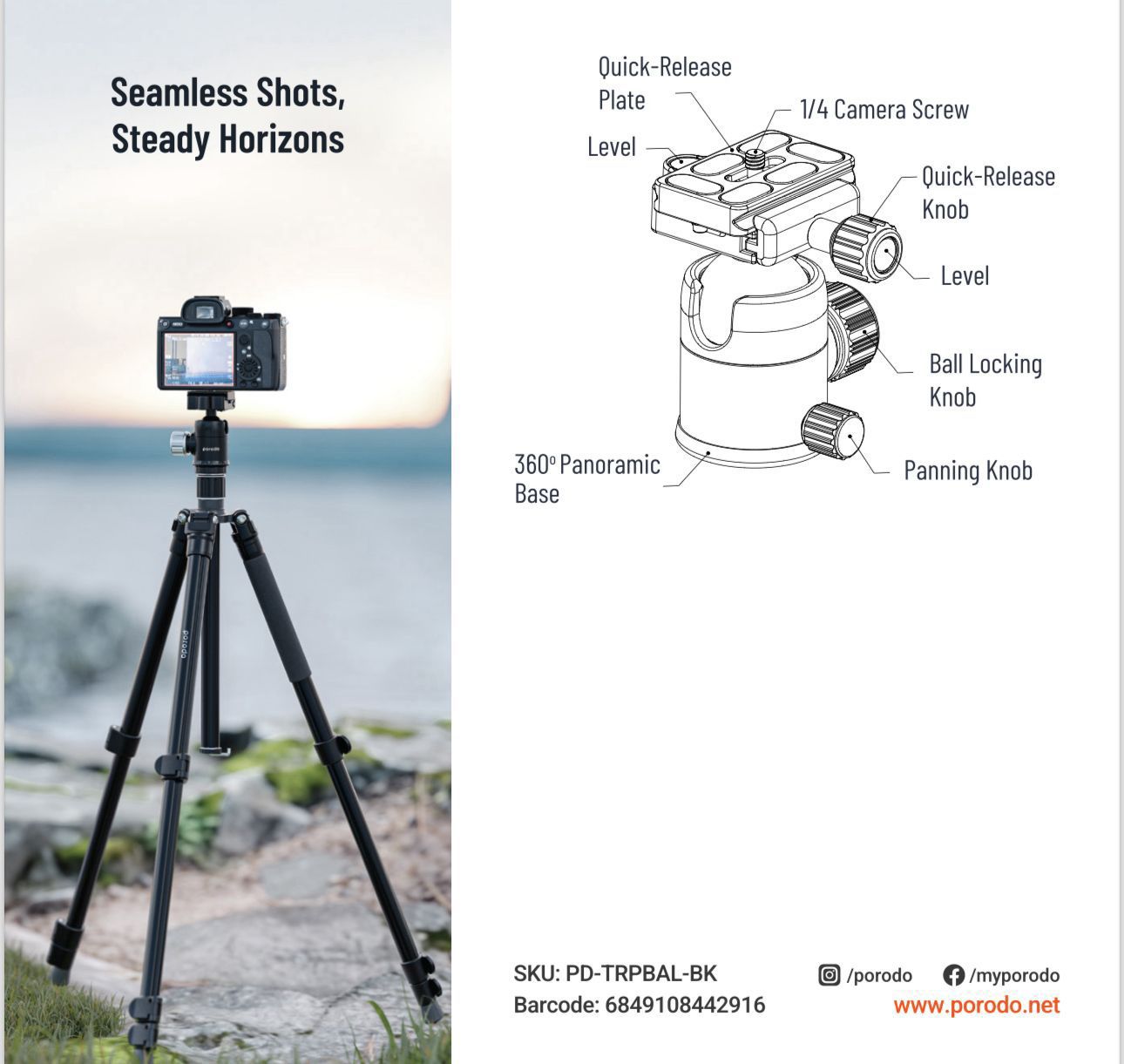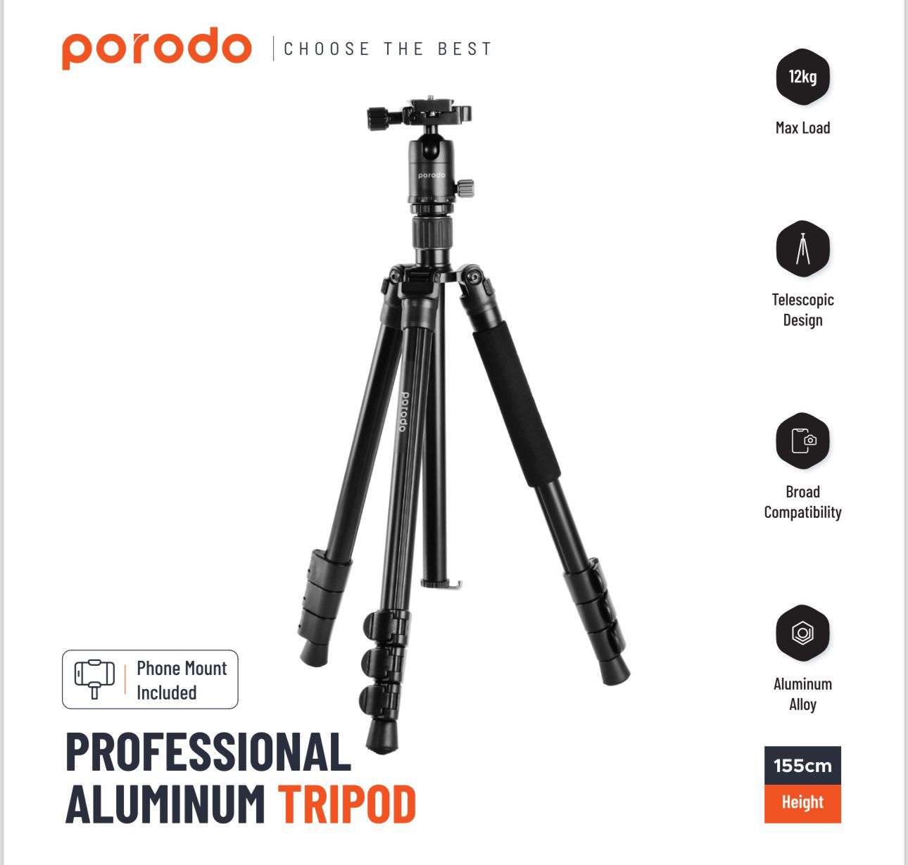 ستاند للكاميرا مع ستاند للهاتف حامل ثلاثي من الألومنيوم من بورودو احترافي بارتفاع 155 سم