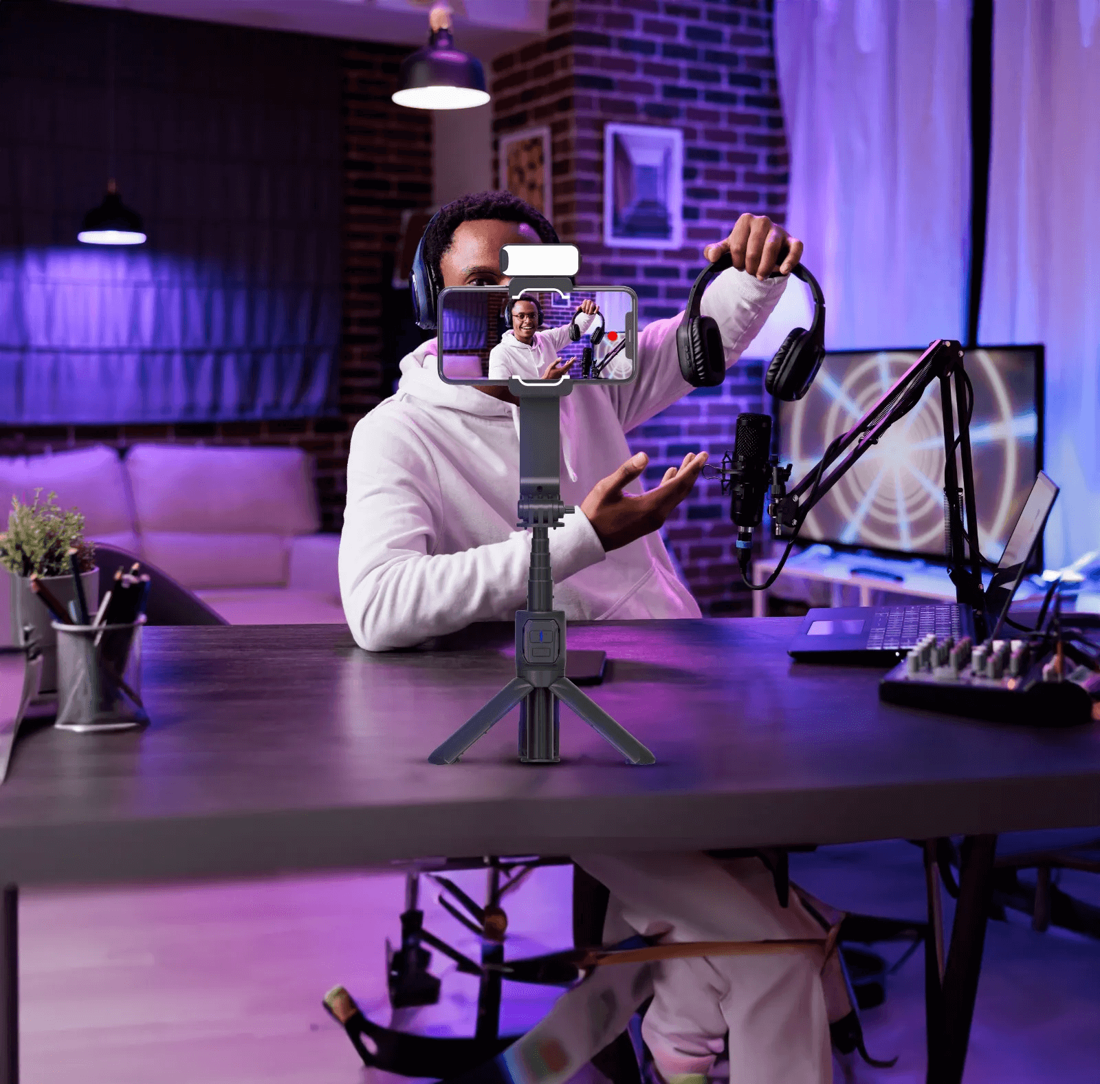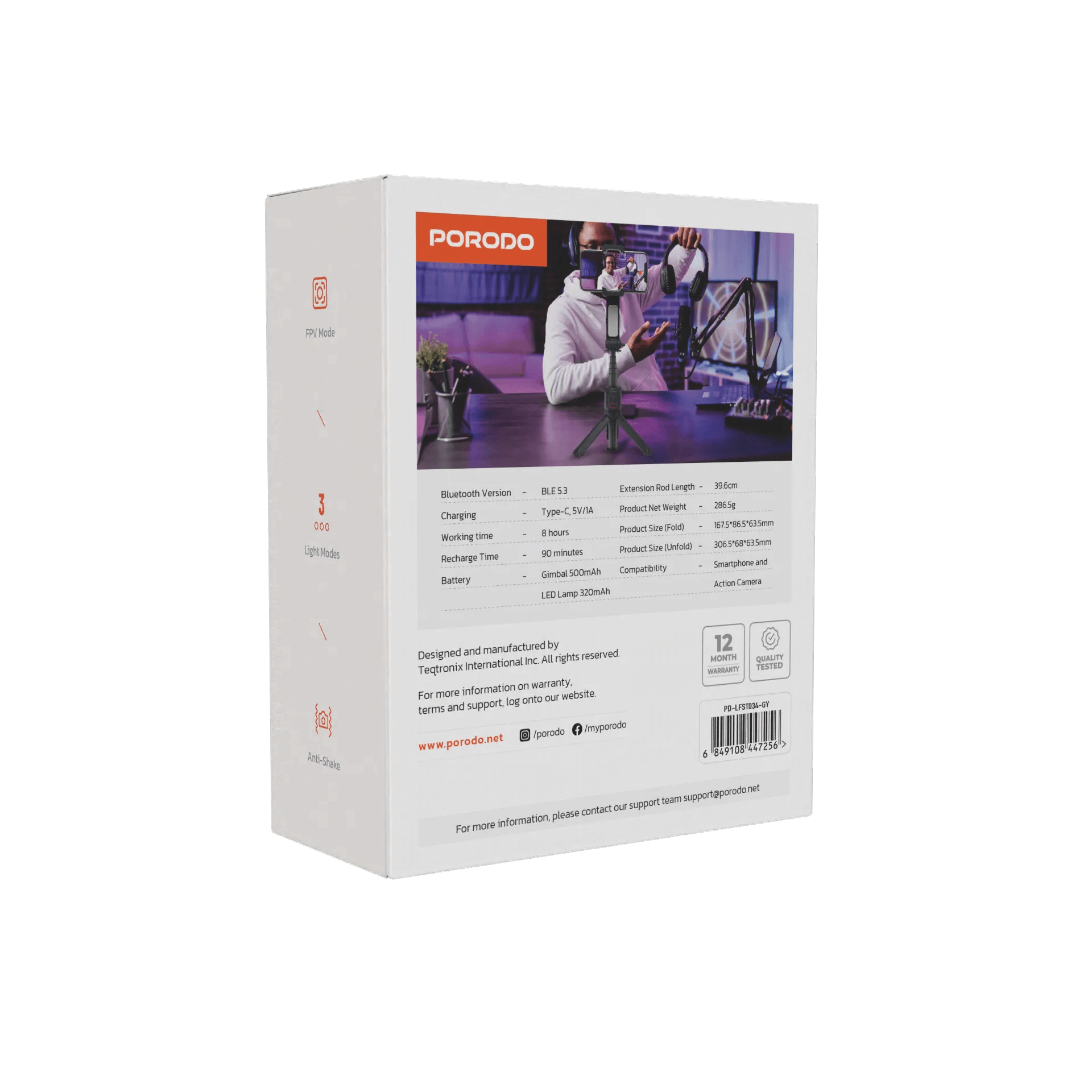 ستبلايزر ستاند ضد الاهتزاز حامل جوال للتصوير مانع للاهتزاز بطول قابل للتعديل بورودو Porodo Anti-Shake Gimbal With Rotatable C