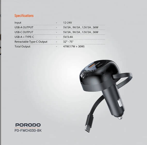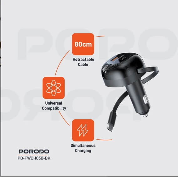 يُقدم شاحن السيارة بورودو ثنائي المنفذ، المزود بكابل Type-C قابل للسحب بطول 80 سم، حلاً مثاليًا لشحن الهواتف المحمولة بكفاءة عالية ودقة متناهية
