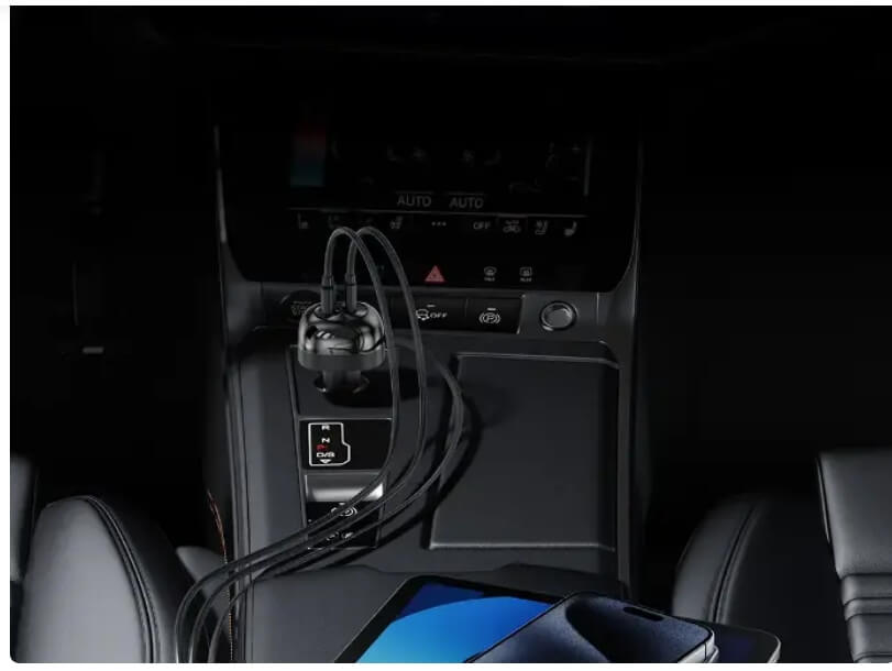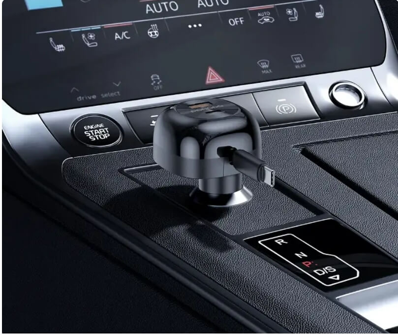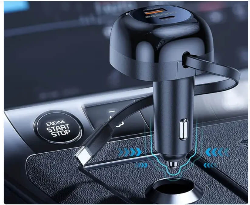 شاحن سيارة بورودو ثنائي المنفذ، كابل Type-C قابل للسحب بطول 80 سم – أسود