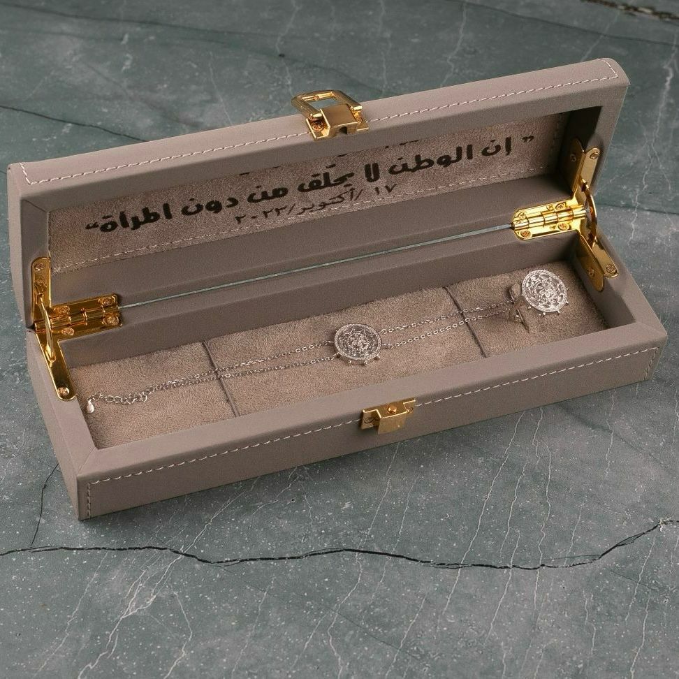 طقم اسوارة وخاتم فضة خالص عيار 925 في بوكس فخم وكتابة عبارة من اختيارك (يوم المرأة العمانية)