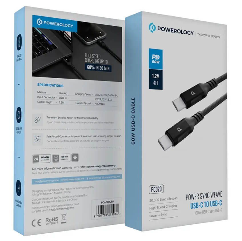 كيبل شحن كابل Powerology Power Sync Weave USB-C إلى USB-C PD بقدرة 60 واط