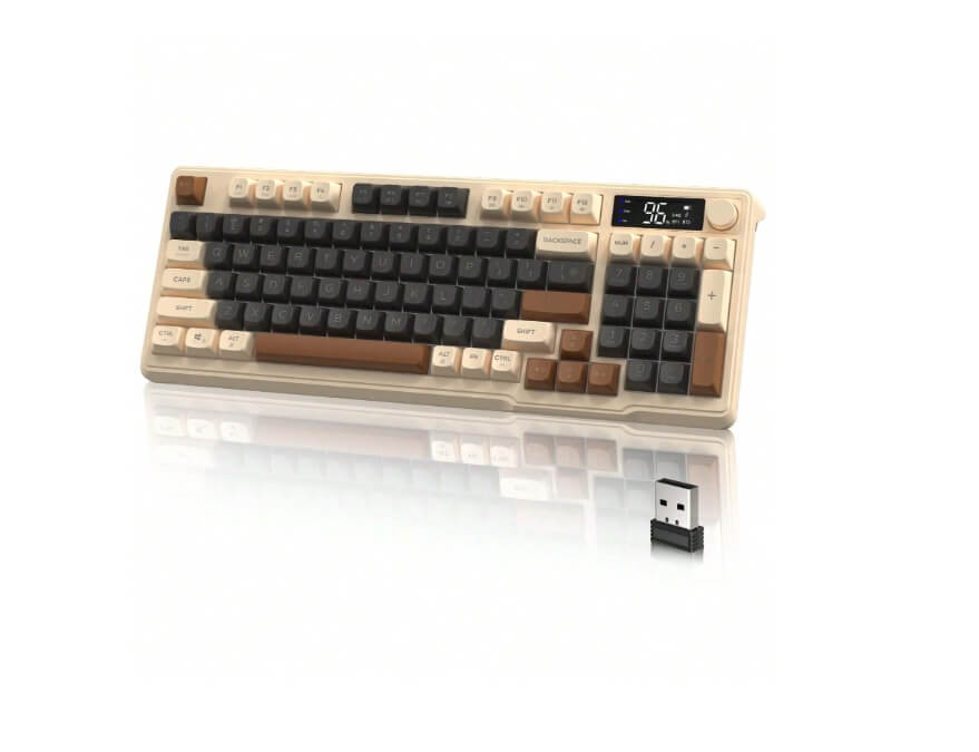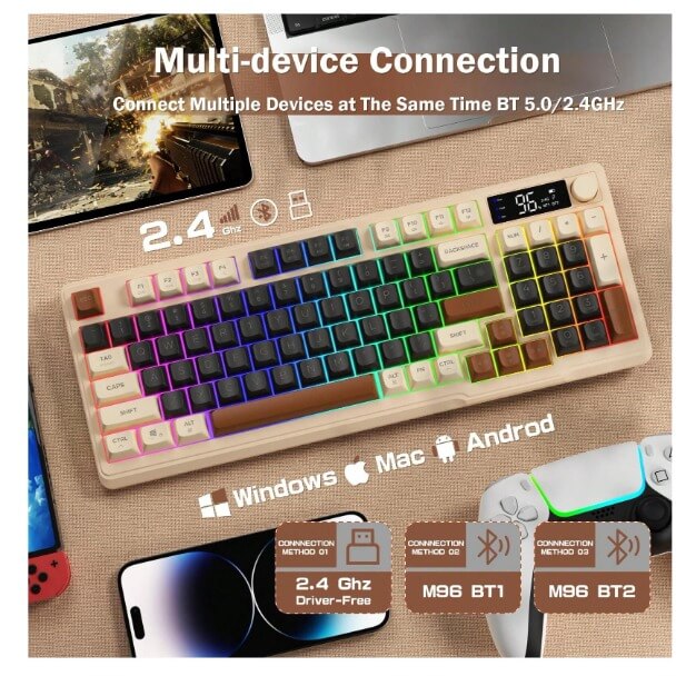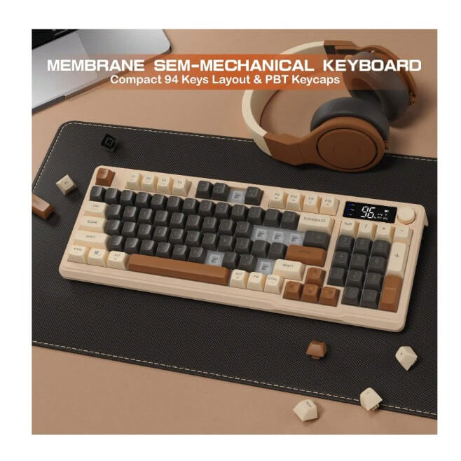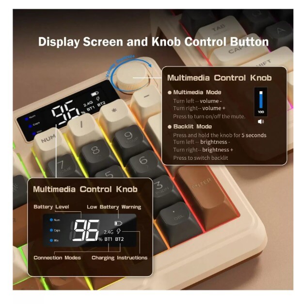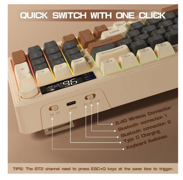 كيبورد جيمنج لاسلكي احساس ميكانيكي FREEWOLF مع شاشة عرض لوحة مفاتيح بمفاتيح متعددة الوسائط، بلوتوث 5.0