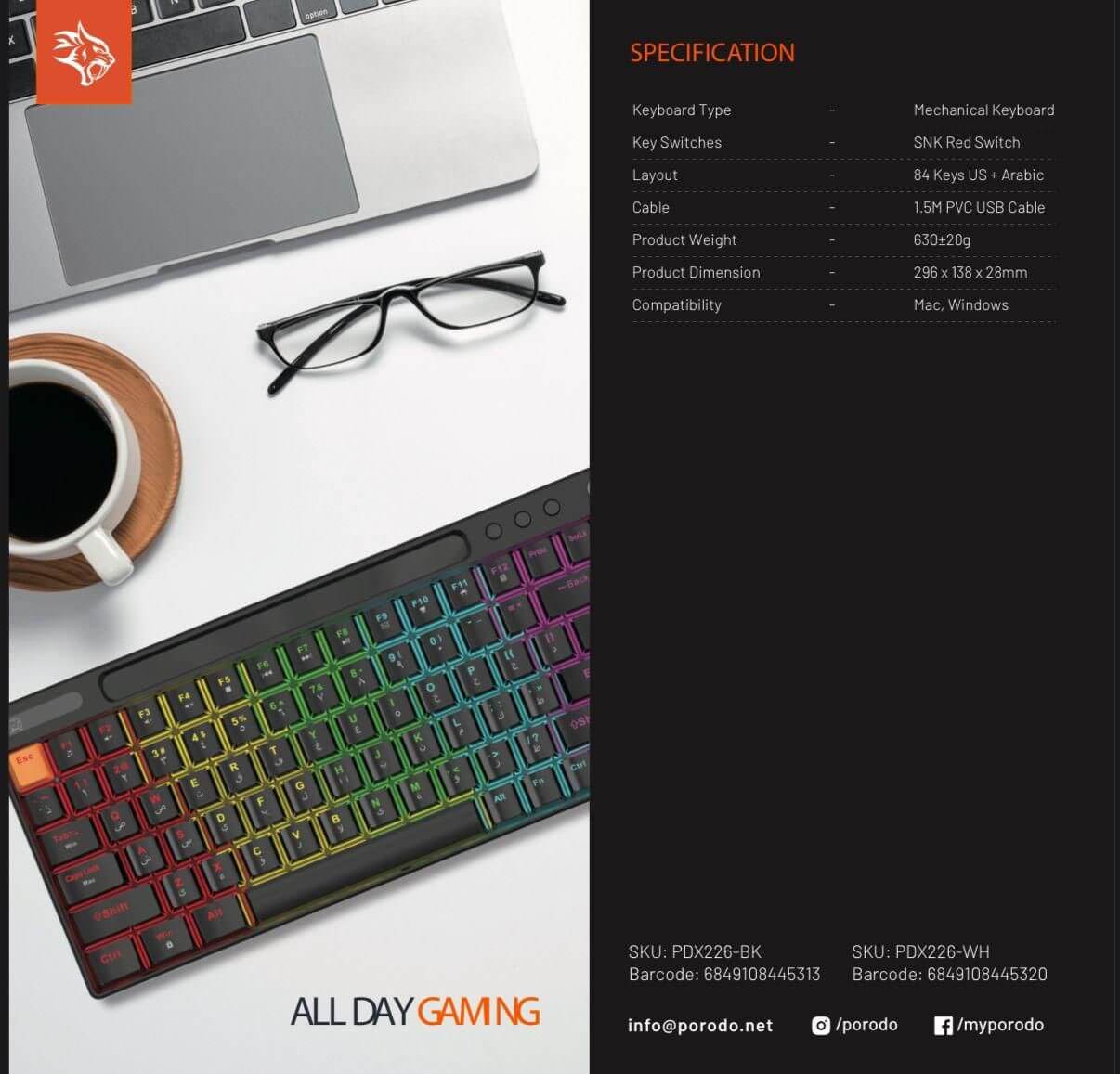 كيبورد جيمنج ميكانيكي سوتش احمر لوحة مفاتيح الألعاب الميكانيكية Porodo Gaming 84 Keys