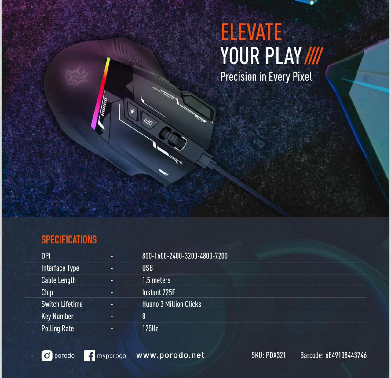 ماوس جيمنج ماوس ألعاب بورودو بدقة 7200 نقطة في البوصة و8 مفاتيح قابلة للبرمجة