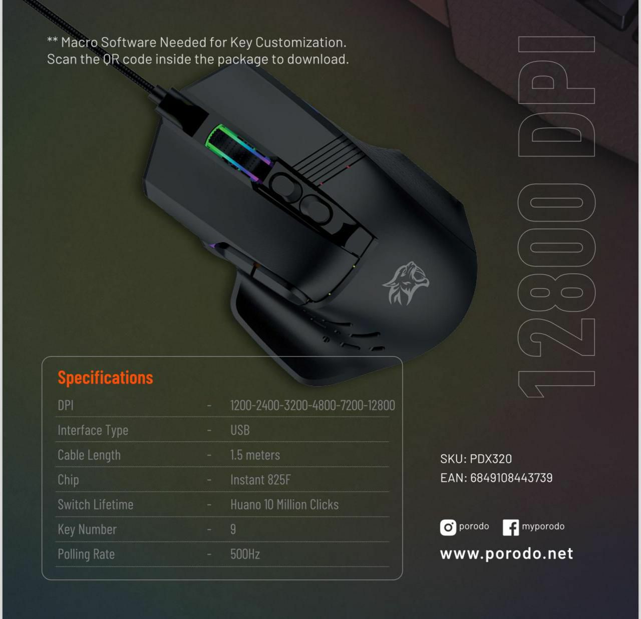 ماوس جيمنج ماوس الألعاب Porodo Gaming بدقة 12800 نقطة في البوصة و9 مفاتيح قابلة للبرمجة