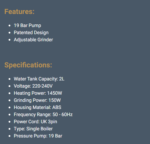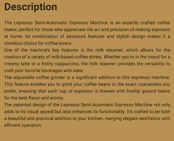 سمات: مضخة 19 بار تصميم براءة اختراع طاحونة قابلة للتعديل تحديد: سعة خزان المياه: 2 لتر الجهد: 220-240 فولت قوة التسخين: 1450 واط قوة الطحن: 150 واط مادة الإسكان: عبس نطاق التردد: 50 – 60 هرتز سلك الطاقة: المملكة المتحدة 3pin النوع: غلاية واحدة مضخة الضغط: 19 بار وصف ماكينة تحضير الإسبريسو شبه الأوتوماتيكية من Lepresso هي ماكينة صنع القهوة مصنوعة بخبرة، وهي مثالية لأولئك الذين يقدرون الفن والدقة في صنع الإسبريسو في المنزل