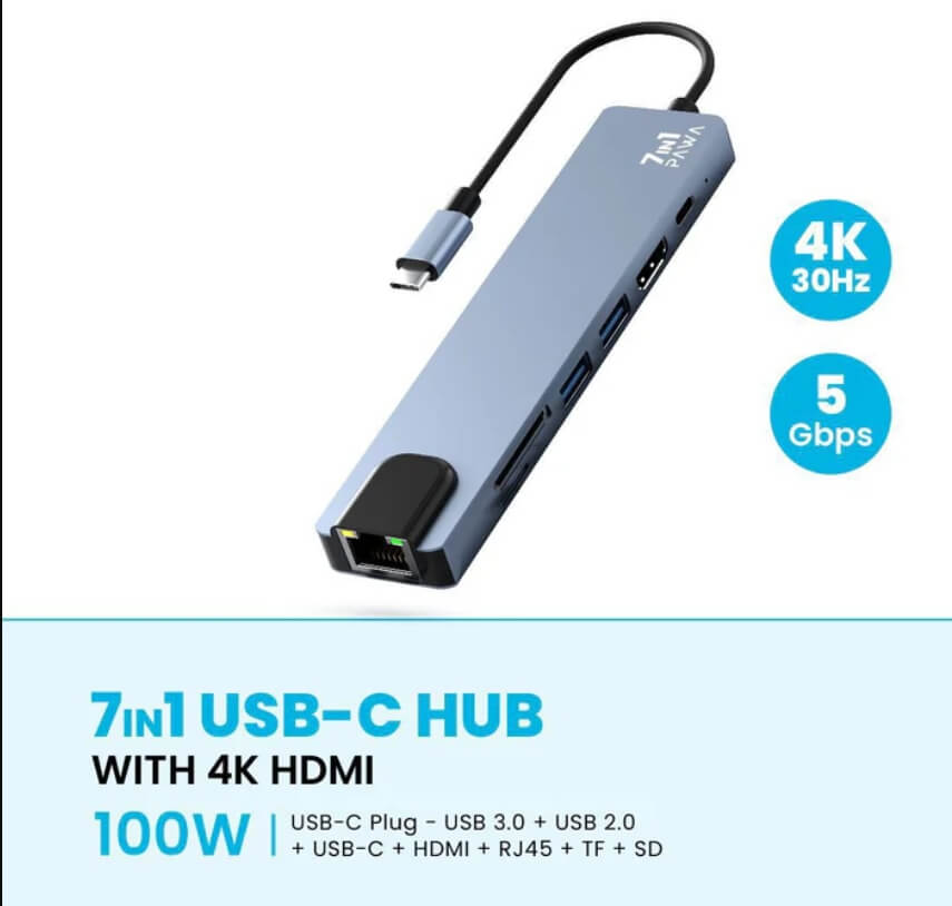 وصلة موزع USB-C 7 في 1 من باوا مع منفذ HDMI بدقة 4K بقوة 100 وات PW-TCHUB714،