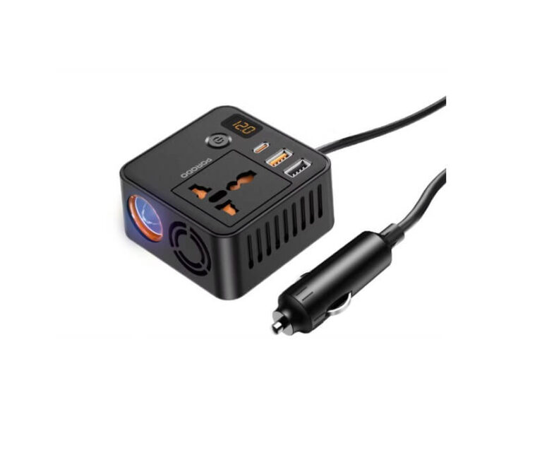 محول طاقة للسيارة باورولوجي 150 وات تيار متردد عالمي USB A 2type-C تيار مستمر للسيارة 12 فولت 10 أمبير – أسود